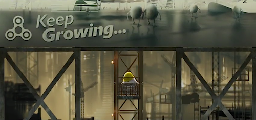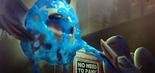 The Metropolis cityscape is a suffocatingly polluted, concrete jungle overpopulated with minions. An attack begins. Its weapon is a blue goo that combusts minions. As the attacks builds gradually to an intense crescendo, newspapers incite panic and governments “hose the flames”…