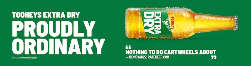 World-first, category-changing, world-leading – Tooheys Extra Dry is claiming to be none of these. It’s touting itself as Proudly Ordinary. It is, however, appealing to the universal enjoyment of self-effacing humour and Australia’s national pride in its Aussie-ness.