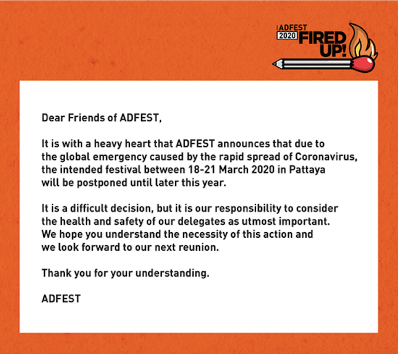 The coronavirus is causing problems throughout Asia Pacific. As a precaution, AdFest has been postponed.