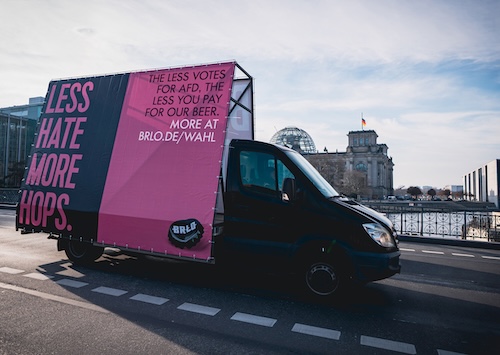The activation, Less Hate, More Hops, for boutique beer brand, BRLO, uses beer prices to counter the German Far-Right. The fewer votes the far-right Alternative für Deutschland (AfD) receives in the 2025 federal election, on Sunday, February 23, the cheaper the beer will become.
