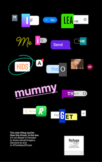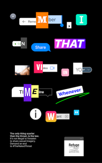 The charity has teamed up with Cosmopolitan and Love Island alumnus Zara McDermott to lobby the UK government to make it illegal to threaten share explicit images of someone and AMV BBDO has created their striking campaign. #TheNakedThreat creative draws parallels between messages saying explicit images will be made public and traditional ransom notes – which are illegal. The work is based on real messages received by domestic abuse victims, led by the testimonial of Natasha Saunders, whose ex-husband is now serving a 12-year jail sentence.