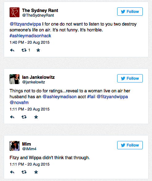 Australian radio listeners took their anger out on Nova 96.9’s top rating breakfast hosts, Fitzy and Wippa. The duo offered to check anyone’s email address against the data released by hackers in the first dump, for any female listener who suspected her partner was cheating. And then did. They told one woman that her husband was registered. That triggered a lot of outrage, but not at Ashley Madison:
