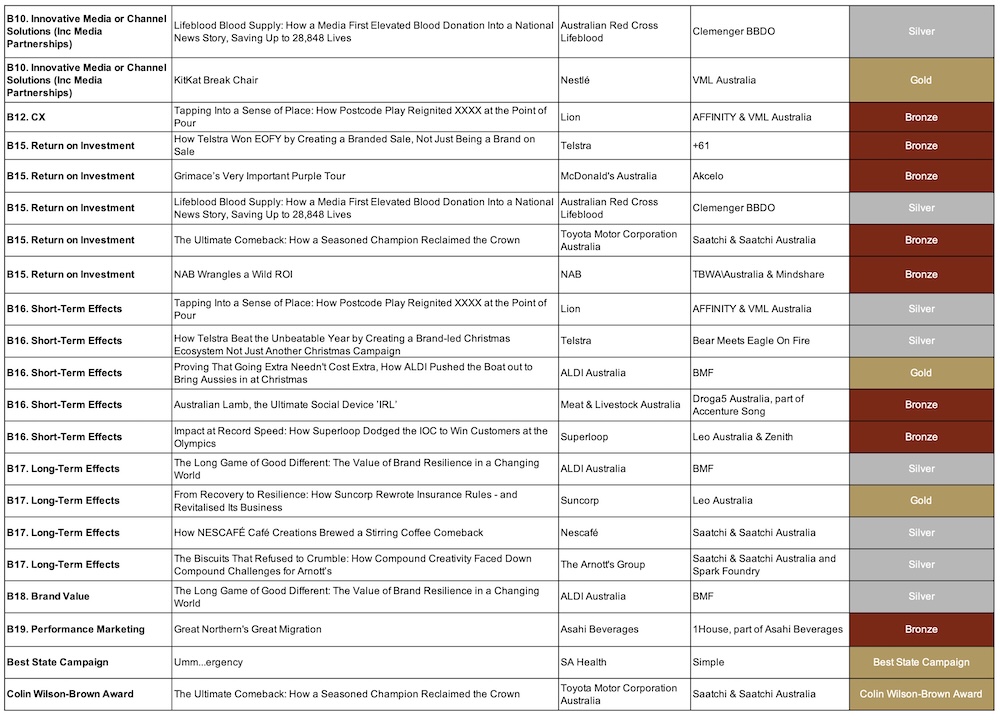 The Colin Wilson-Brown Award, honouring the Effie Chairman, was presented to Saatchi & Saatchi Australia for The Ultimate Comeback: How a Seasoned Champion Reclaimed the Crown, for Toyota Australia.