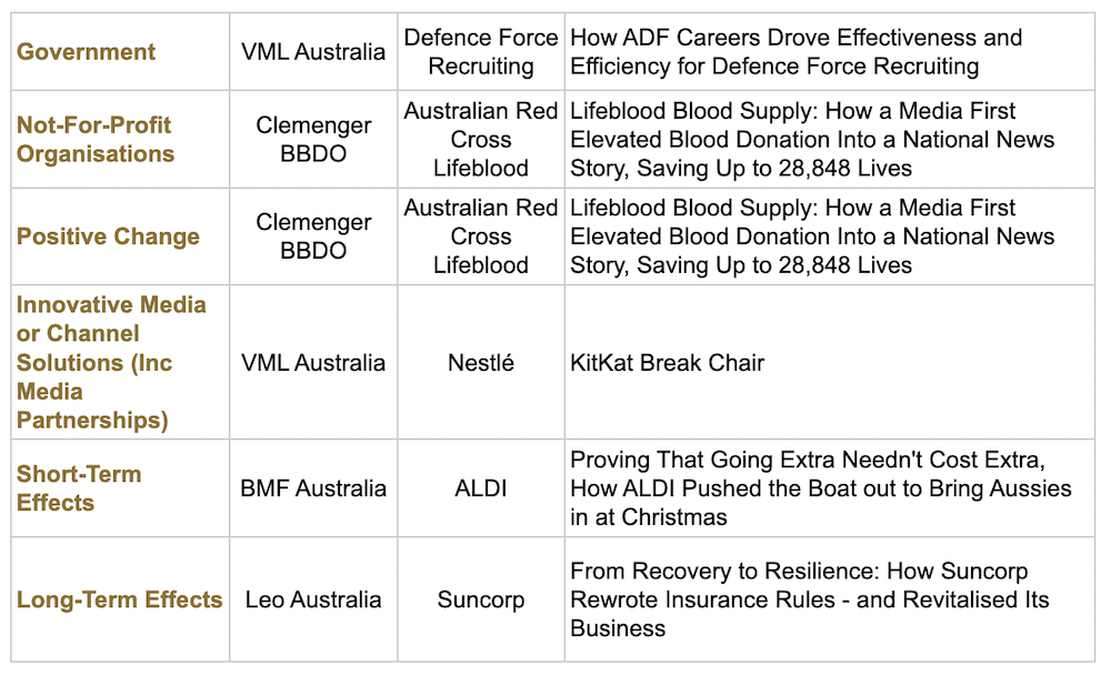 VML Australia won 2 golds, one for How ADF Careers Drove Effectiveness and Efficiency, for Defence Force Recruiting, and the other for KitKat Break Chair, for Nestlé, which the judges called an outstanding, innovative, and highly effective campaign built on the strength of its thought and planning.