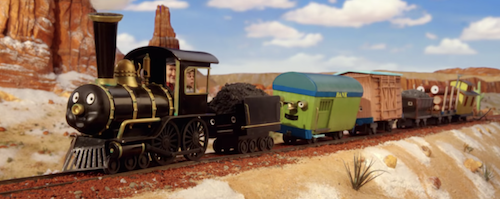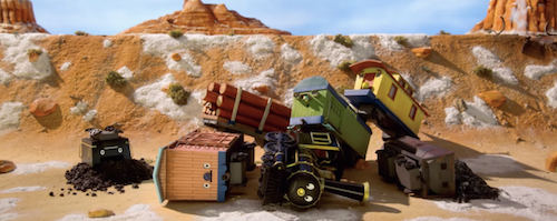This is the first ad in the series in which the characters are aware of the transformation mid-film – an idea Wilson added. He also wrote the spot’s opening tune as well as the song the engines sing as they’re climbing back on the track