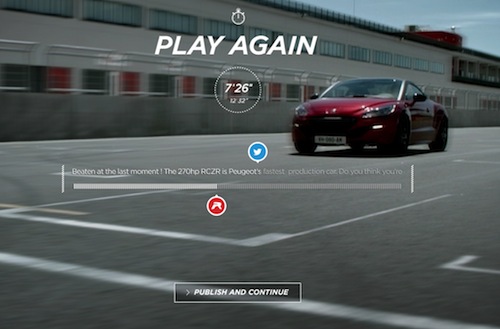 In #RCZRace for Peugeot, Tweeters pit their speed against the new Peugeot with its 270 horsepower engine. They tried to type any one of 15 different 140-character tweets before the car reached its max speed.