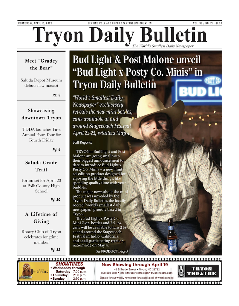 The humour continues with the announcement of the Bud Light x Posty Co. Minis partnership breaking on the cover of “the smallest newspaper in the world”, the Tryon Daily Bulletin.