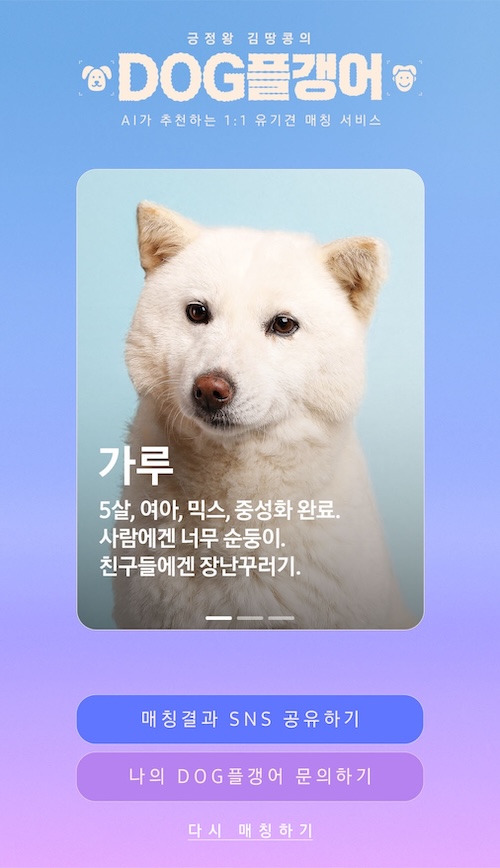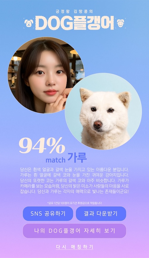 The match result shows detailed information about each person’s furry match such as its name, age, and characteristics along with a similarity score and description of why the person and the chosen shelter dog are a perfect match to spark an instant emotional connection. With one click of a button, people can inquire about its adoption immediately. Moreover, every time participants share their matching results on social media, 100 won will be donated to KoreanDogsSanctuary Rescue to support shelter dogs.
