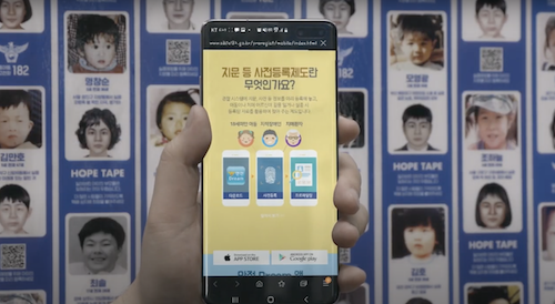 Cheil’s packaging tape, called Hope Tape, contains details of 28 children who have been missing for a long time. It carries children’s photos taken at the time of their disappearance, their age progression images using KNPA’s technology, and other information including their physical features and places last seen. It also contains QR code that connects to the police department’s dedicated mobile app where people can report and search about missing children, and register fingerprints of their children that can be later used in case of disappearance.