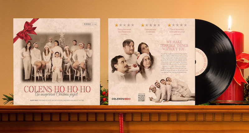 The Colens-ho-ho-ho Christmas single features Colenso employees singing Silent Night. Widely regarded as a horrible song in the first place, it has been masterfully made worse. Performed by a stellar cast of people who were available at the time, the 10-inch pressed vinyl is aurally offensive. Colenso designers then dedicated themselves to making it visually offensive, too.