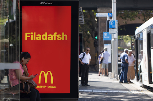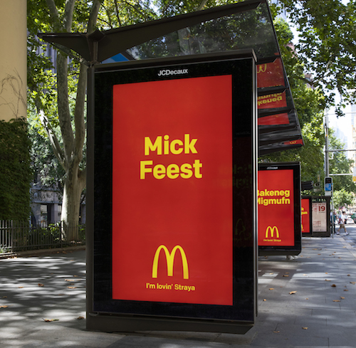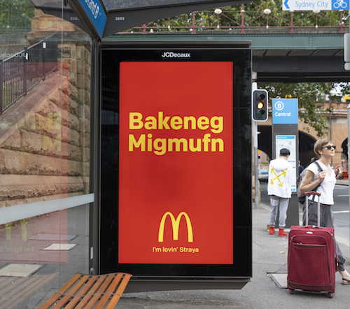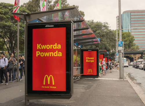 So right across Australia, DDB Sydney has placed posters which spell phonetically the most important words in the Australian language, according to Macca’s. Words like Bakeneg Mugmufn, Filadafsh and Kworda Pownda.