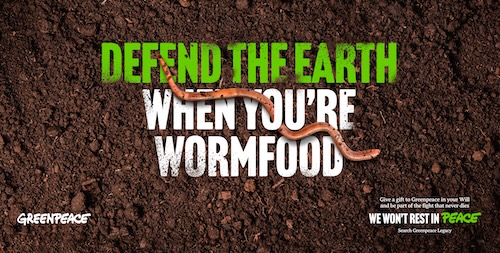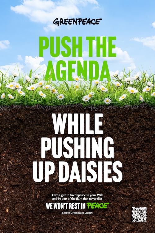 John Hutchin, head of key relationships marketing at Greenpeace, stated, “Gifts in wills fund one in six Greenpeace campaigns, so this is an incredibly important initiative for us, and we couldn’t be more excited about it. We Won’t Rest in Peace is a powerful call to arms, proving that the fight for our planet doensn’t end with us. By leaving a gift to Greenpeace in your will, you can ensure that the fight for a healthy planet lives on of generations to come.”