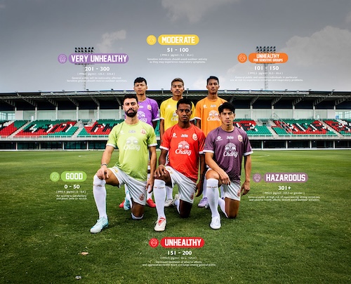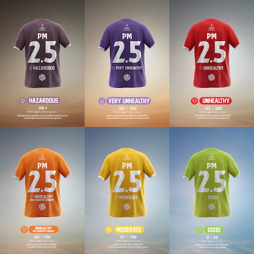 Northern Thailand Thai football league, Lamphun Warriors F.C., has joined with the Northern Thailand Breath Council (NTBC) and creative agency, Flash Bomber, to launch a unique awareness campaign, The Air Pollution Jersey. The campaign replaces Lamphun Warriors F.C.’s traditional white home jersey with a collection of six jerseys, each in a distinct colour visually representing the the severity of PM2.5 air pollution based on the Air Quality Index (AQI) levels on match day.