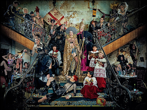 Gerard and Marc have recycled trash to recreate a royal coronation scene set in a modern-day inner-city setting. The images are based on true stories of modern pubs, run by the women who held the licenses as men were seen to be unreliable drunks. In order to survive in the 1970s beyond being a bar, they opened their doors to young musicians and held gay nights. The pair commissioned local artist and jewellery designer, Danielle Zanetti, to create the hand-made detailed jewellery and costumes in the images from bottle tops and recycled garbage. Over two years were spent transforming these materials into the royal cape, crown and royal Jewels for the shoot. The hand-made upcycled dresses were created by local designers, Two Threads.
