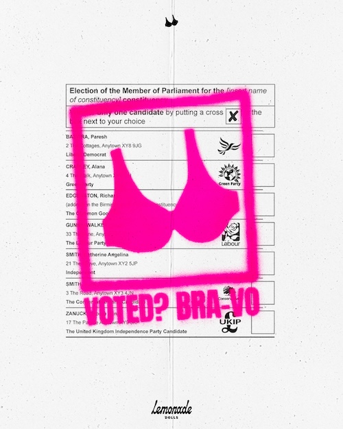 From June 14 to July 4 Lemonade Dolls is offering 5% of all profits made from their website to young women’s trust – an organisation which works to achieve economic justice for young women by tackling misogyny and sexism head on. Lemonade Dolls will also be giving 20% off on all bra orders from June 14 until election day on July 4 with the code SWINGIT20, along with the sale of a new vote collection aimed to help spread the word.