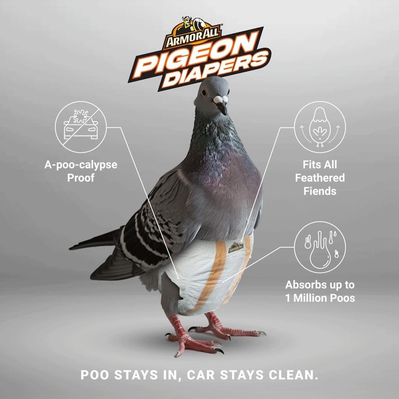 But in Malaysia, Armor All and Havas Malaysia have come up with a a beauty. Pigeon diapers. Bird poo is the enemy all car owners share, so pigeon diapers are a dream come true invention (if only they were true) The diaper is claimed to fit any bird to prevent an a-poo-calypse from striking any car.