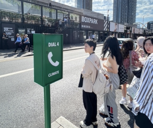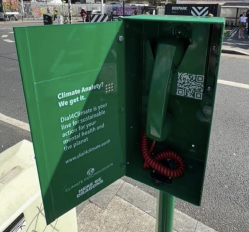 And London agency, Here Be Dragons, has created a campaign for them, a collection of unconventional phone booths that aim to raise awareness about climate change and overcome anxiety about it. Their Dial4Climate phone booths, inspired by emergency SOS motorway call booths, were launched in Paris at environmental event, Change Now, and in London, first at Shoreditch then Hackney. The public can pick up the phone to listen to messages aimed to alleviate climate anxiety, with advice from Climate Psychologists founders, Megan Kennedy-Woodard and Dr Patrick Kennedy-Williams.