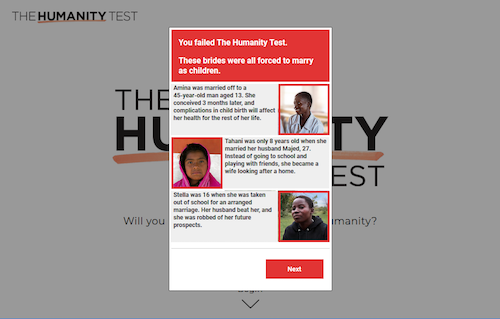 It turns out that The Humanity Test was a campaign in partnership with UN Women NC UK to raise awareness of the 39,000 girls forced into child marriages every day. 72% of those who tried could not accurately identify images of all brides.