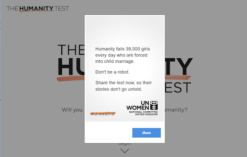 The test then prompts participants to help #drawaline against child marriage – which affects 750,000 women and girls around the world, yet is rarely discussed as a major humanitarian problem. Participants can support the cause further by sharing the humanity test across social media, and spreading awareness about the issue, mobilising support for the cause and UN Women NC UK’s mission.