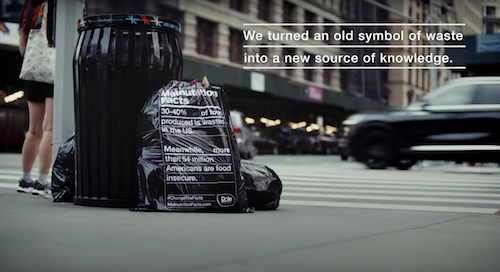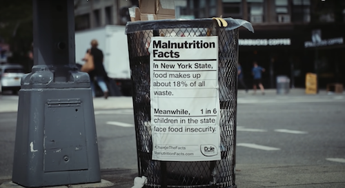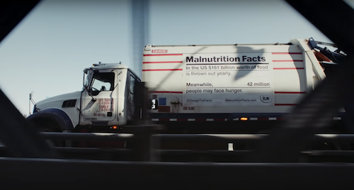The campaign launched in February, features artwork that resembles nutrition labels, listing facts about food issues throughout the world – obesity, food insecurity and malnutrition among them. In the first phase of the campaign the Malnutrition Labels were giant billboards across the US. Now, they’re on rubbish bags, waste and recycling bins, and garbage trucks in New York City.