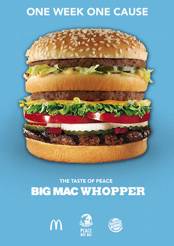 It needed that. Burger King proposed that six elements would be taken from each signature burger to create the hybrid, which would be sold for one day only at a pop-up shop in Atlanta, with proceeds going to the charity and the two brands doing their bit to promote world peace.