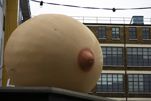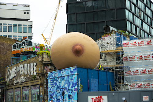 The five boobs vary in size, with the smallest standing at 3m and the largest at 6m tall, representing the range of women’s breasts. Each one was positioned at a key location around the city – Grind Shoreditch, in the heart of Old Street; Village Underground alongside their iconic tube carriages; Neutral on Colombia Road; Ely’s Yard and Huntington Estate in east London. They stayed there all Sunday and Monday.