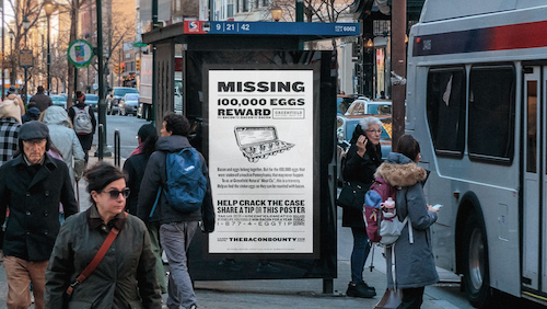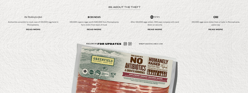 On February 1, 100,00 eggs were stolen from the back of Pete & Gerry’s Organics’ distribution trailer in Pennsylvania. No Fixed Address and Greenfield Natural Meat Co., the brand of humanely produced bacon, saw the tactical ad opportunity immediately. Bacon without eggs is a tragedy…and the bizarre robbery was making headlines right across the US (and even in the UK).