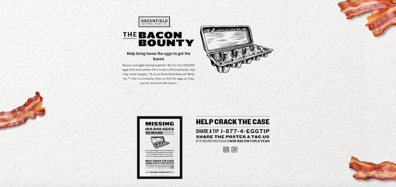They enlist the helped of internet sleuths to solve the crime baffling detectives. Their Bacon Bounty offered a year’s supply of free bacon to anyone who helped to crack the case of the missing eggs. Greenfield asked people to share the MISSING EGGS poster, which could be found on TheBaconBounty.com and on Instagram @greenfieldmeatco, and phone in tips or clues about the whereabouts of the stolen eggs via their Bacon Bounty Tip Line at 1-877-4EGGTIP.