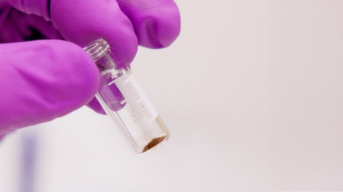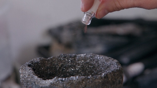 The iron from the menstruation sample was extracted by Professor Jonas Bergquist at Uppsala University, then merged with fossil free Swedish iron sponge produced by LKAB and refined into steel by Swerim. A Swedish jewellery designer shaped the material into a form inspired by geological textures, mineral layering and bodily cycles.