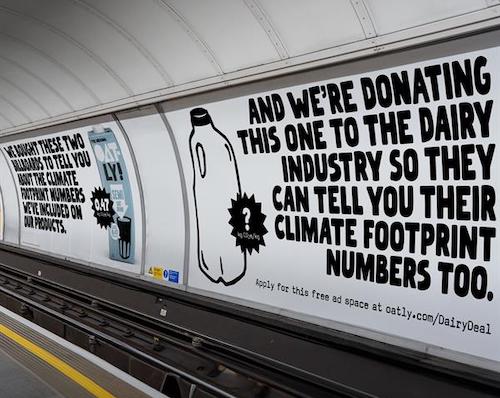 Oatly’s provocative personality has found a new way to get under the skin of its dairy rivals. The company has bought adjacent prominent billboard spaces. On the left side, Oatly posted its climate footprint, 0.47 kg Co2/kg. It offered the right side free to dairy companies if they publish the full climate footprint of their products.