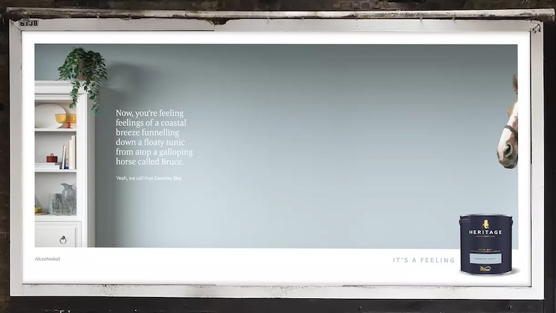 The OOH campaign, It’s a Feeling, shows Dulux colours in stylish home settings but it’s the copy that compels – the paint colour is described in terms of how it makes you feel.