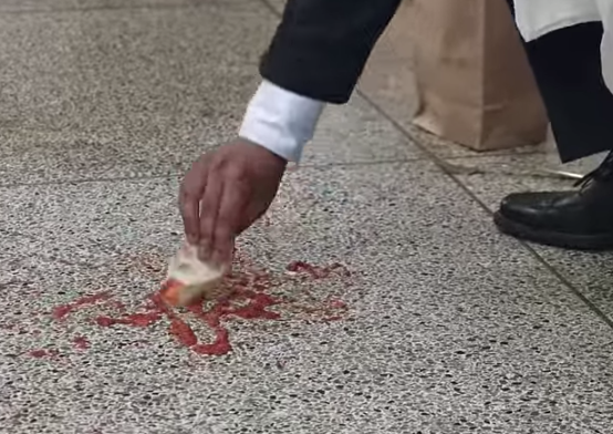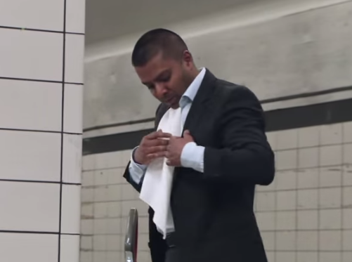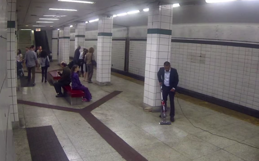 The scene: An underground station platform. A man in a suit plugs in the Bissell, cleans one tile, then uses it as a plate for his takeaway dinner.