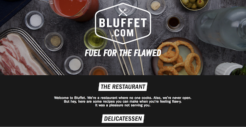 …and the website of a restaurant called Bluffet (Fuel for the Flawed) (bluffet.com), which doesn’t exist but offers recipes for when you’re flawed.