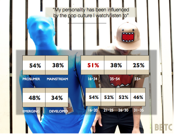 4. Popular culture is a major influencer. 51% of 16-34s feel that the pop(ular) culture they’ve consumed has influenced their personality. 50% of them also state that their attitudes have been fashioned by pop culture. 57% of 16-34s state that they spend more time consuming global content rather than the cultural content of their country. To reach young people brands, have to know what’s trending (not only on Twitter) throughout the world.