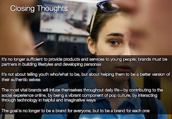 3. Young people don’t want to feel that they are being coerced into buying more. The power has shifted. 41% of them feel that they have the power to contribute to the success or failure of a brand. They understand that they are able to organise themselves into networks and influence each other. So brands need to invent new kinds of relationships with young people.