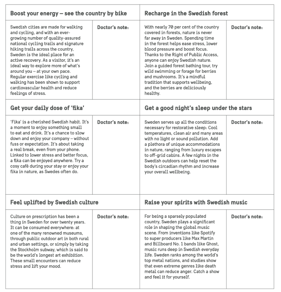 A downloadable medical referral fron Visit Sweden is available to present to their GP, encouraging doctors to recommend Sweden’s natural environment and lifestyle experiences to restore health and wellbeing.