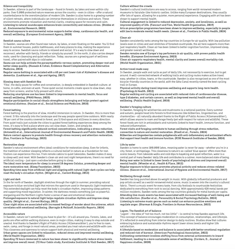 This Swedish Prescription document draws on research highlighting the restorative power of nature, culture and social interaction – areas where Sweden consistently ranks among the world’s leaders. The referral notes (in great detail) the experience Sweden offers and the health & wellbeing benefits they bring – along with the scientific studies that support these.