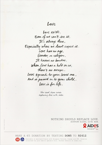 The ads are particularly clever. On its first reading or first view, each is an ode to love that reminds us love exists everywhere. That love has no age, gender or religion and knows no borders. But the print ad also asks to be read with the word AIDS substituted for love and the video repeats with the word, AIDS, substituted for love. Both conclude with the message, Nothing should replace love, and ask for a donation.