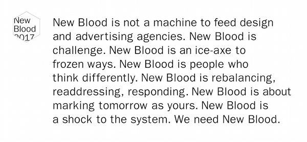 “Our aim was to elevate the New Blood brand from the younger sibling of D&AD into a cutting edge persona at the forefront of the industry. A brand that better represents the intelligence and diversity of new talent coming through – tearing up the establishment and replacing it with new people, new skill sets and new thinking.”