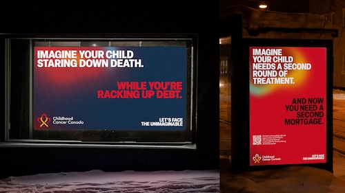 The full campaign also includes OOH, digital, and social rollout designed to make the unimaginable unignorable. The still work poses stark “Imagine” scenarios — such as “Imagine your child needs a second round of treatment” followed by, “and you need a second mortgage” – bringing the financial, emotional, and practical realities families face into sharp focus.