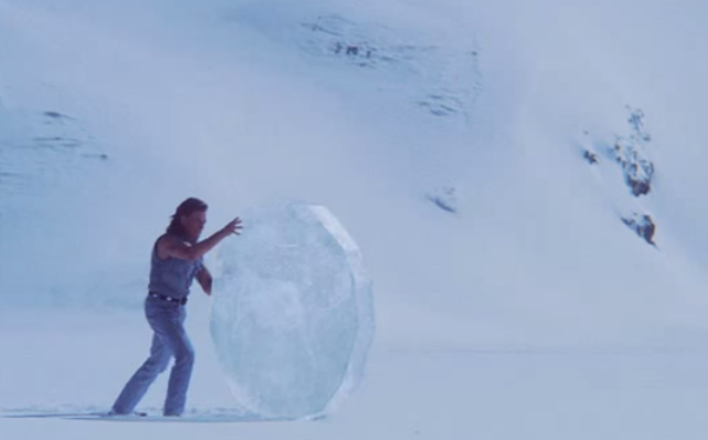 He has managed to grow back his mullet at superhuman speed. And must have stored a set of ripped denim somewhere in the snow. Hasn’t lost his flair for hyperbole either: becoming a one man dog sled team using his ponytail as a towing rope is only the beginning of his OTT physical feats.