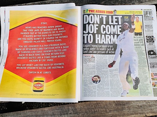 Vegemite was forced into an unfamiliar position last night where we had to take out a full-page ad in the UK newspaper, The Mirror. The ad we ran (please see attached) was in response to Marmite (a softer, gentler, more polite version of Vegemite) handing out free jars of Marmite at the cricket in an attempt to woo those attending.