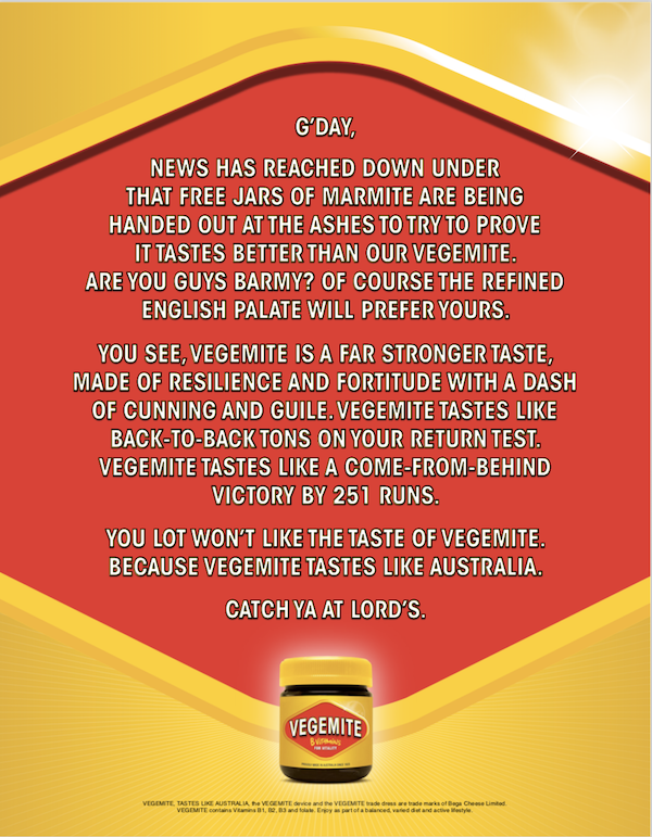 The ad we felt compelled to run, explains why England’s beloved Marmite’s crusade is futile. You see Vegemite is made for Australia, we don’t expect the English to embrace our stronger, more resilient taste, and nor can we imagine many Australians going for a middle order substitute.