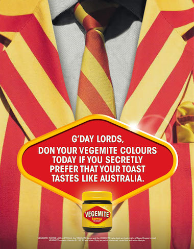 “In an unexpected twist in the battle for yeasty pride, Vegemite is claiming that all members turning out in the traditional red and yellow colours at Lord’s, are actually showing their support for Vegemite,” the brand stated.