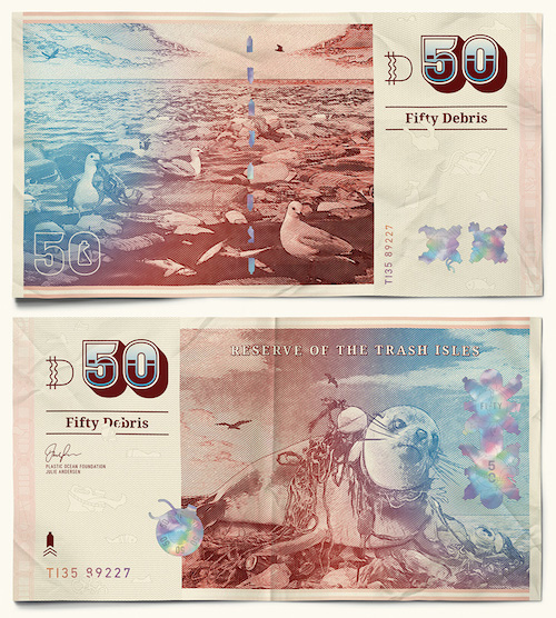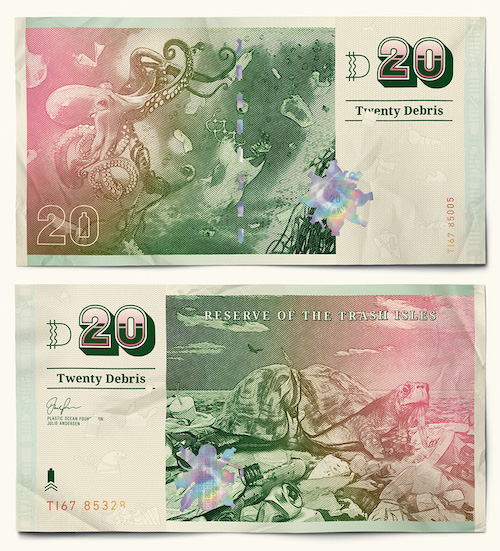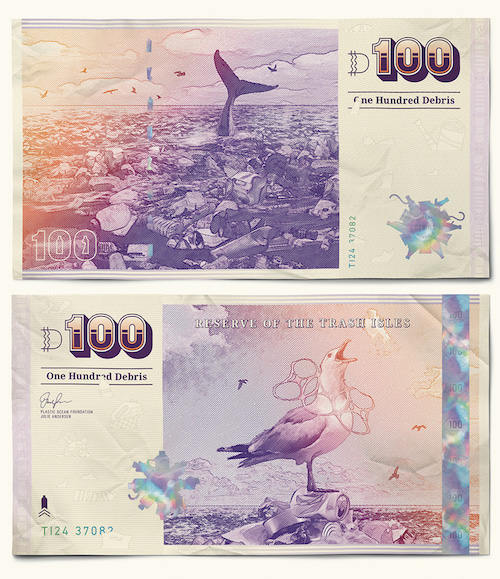 The currency features images of turtles, seals and whales suffering because of floating trash. The flag features a white sky, blue water and a green plastic bottle.