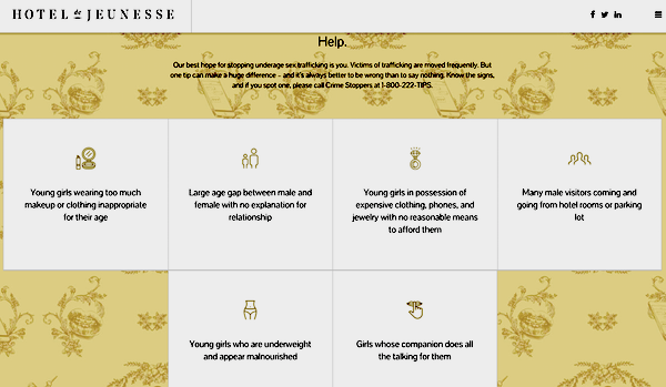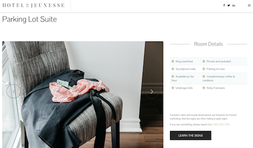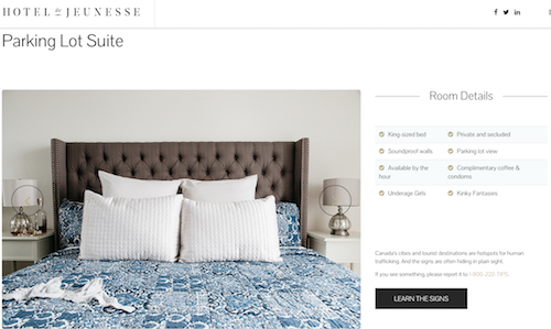 Knowing that hotels are one of the hot spots where sex trafficking occurs, the campaign uses search engine marketing to target people searching for hotel accommodation in the Greater Toronto Area to serve them digital banner ads for Hotel De Jeunesse, a fake hotel found online. At first glance, the site appears to be an innocuous hotel site, with nothing out of the ordinary. But, when you explore the site, it becomes clear to users that it’s not a real hotel but rather a tool to educate the public about how to recognise that sex trafficking is going on.