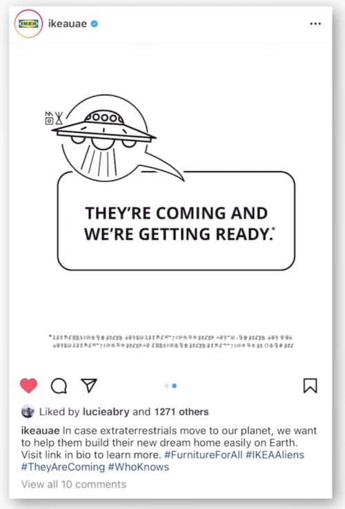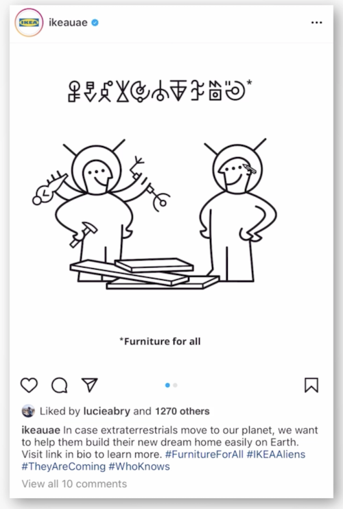 Memac Ogilvy and IKEA, the biggest furniture retailer of the planet earth, decided that IKEA needed to get ready in case aliens would like to build their dream home close to us. To do so, the partners turned the iconic IKEA assembly instructions into instructions for aliens, changing the usual design and alphabet to be alien friendly. Humans thought it was a very cool idea.