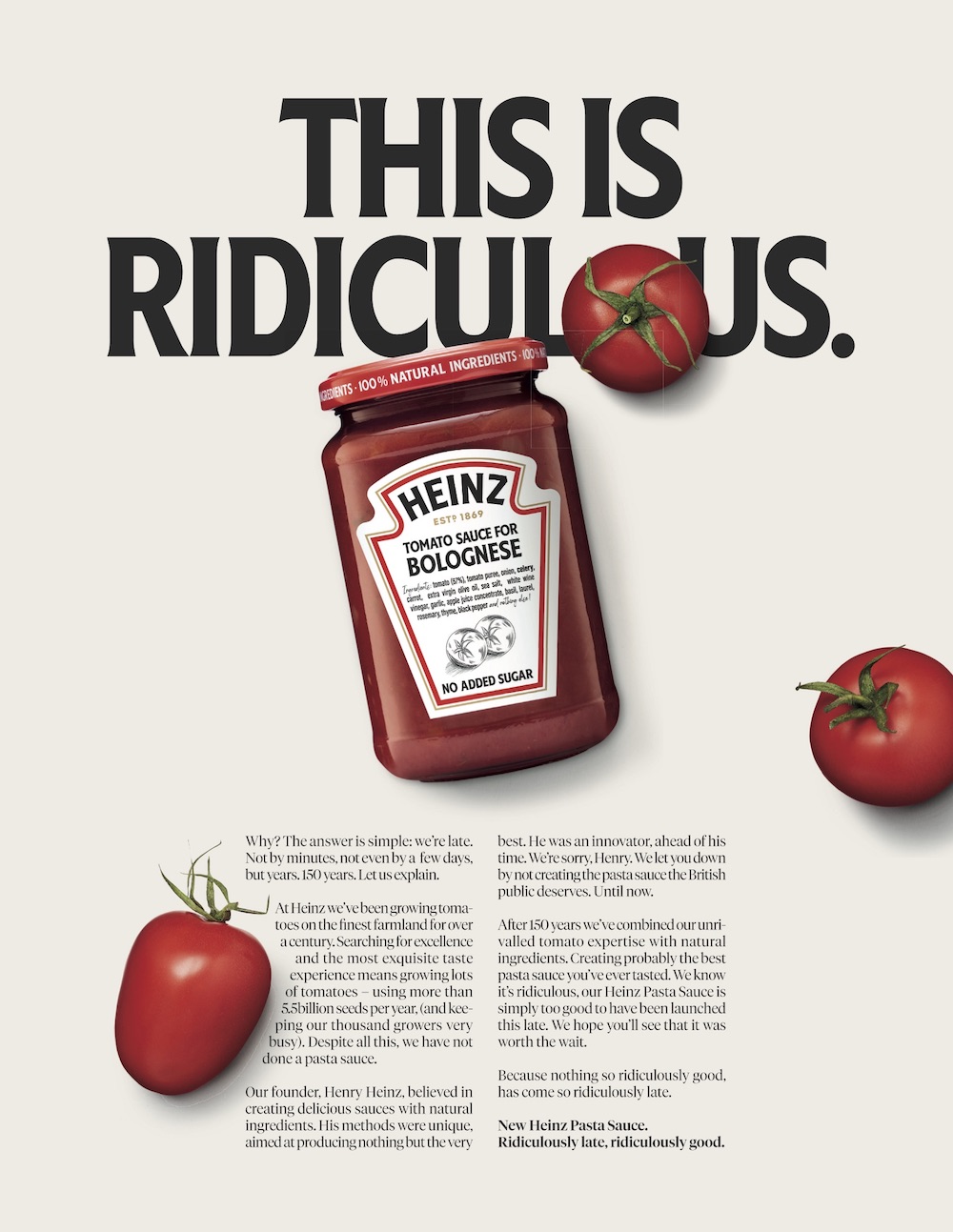 The full-page ad in the Guardian launched a campaign to introduce Heinz pasta sauces – 150 years after the world-famous brand began. The ad apologisies to the British public and Heinz’ founder, Henry Heinz, for not creating the pasta sauce they deserve – until now. The copy explains how Heinz has created “probably the best pasta sauce you’ve ever tasted”, promising consumers that it was worth the wait, “because nothing so ridiculously good, has come so ridiculously late”.